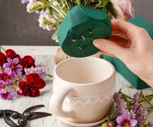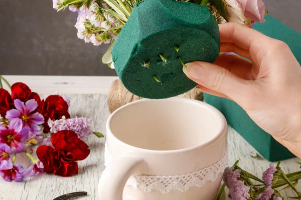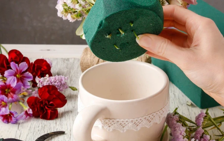 Este aqui é puro charme! Aposte em uma caneca de cerâmica ou em algum bowl mais alto e aplique uma rendinha em volta do objeto. Esse vai se tornar o vaso favorito da sua mãe.